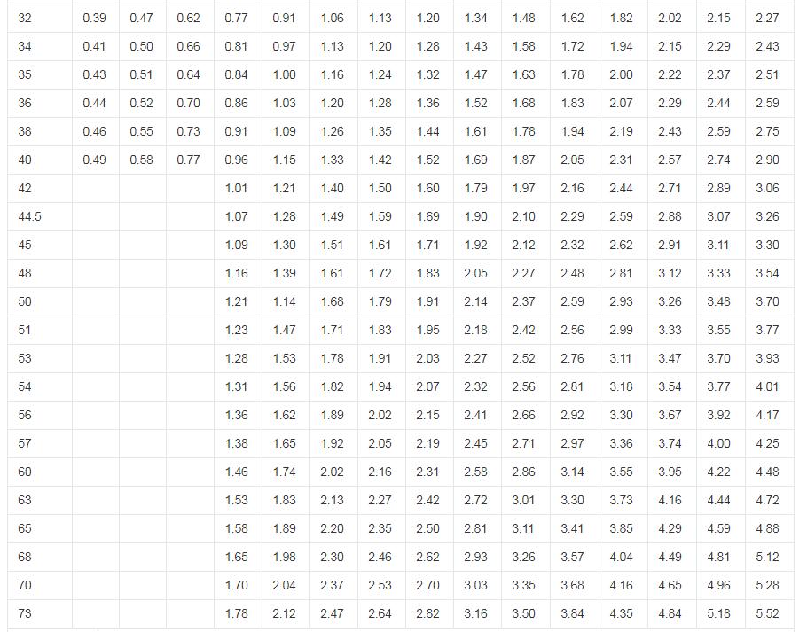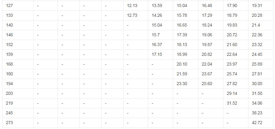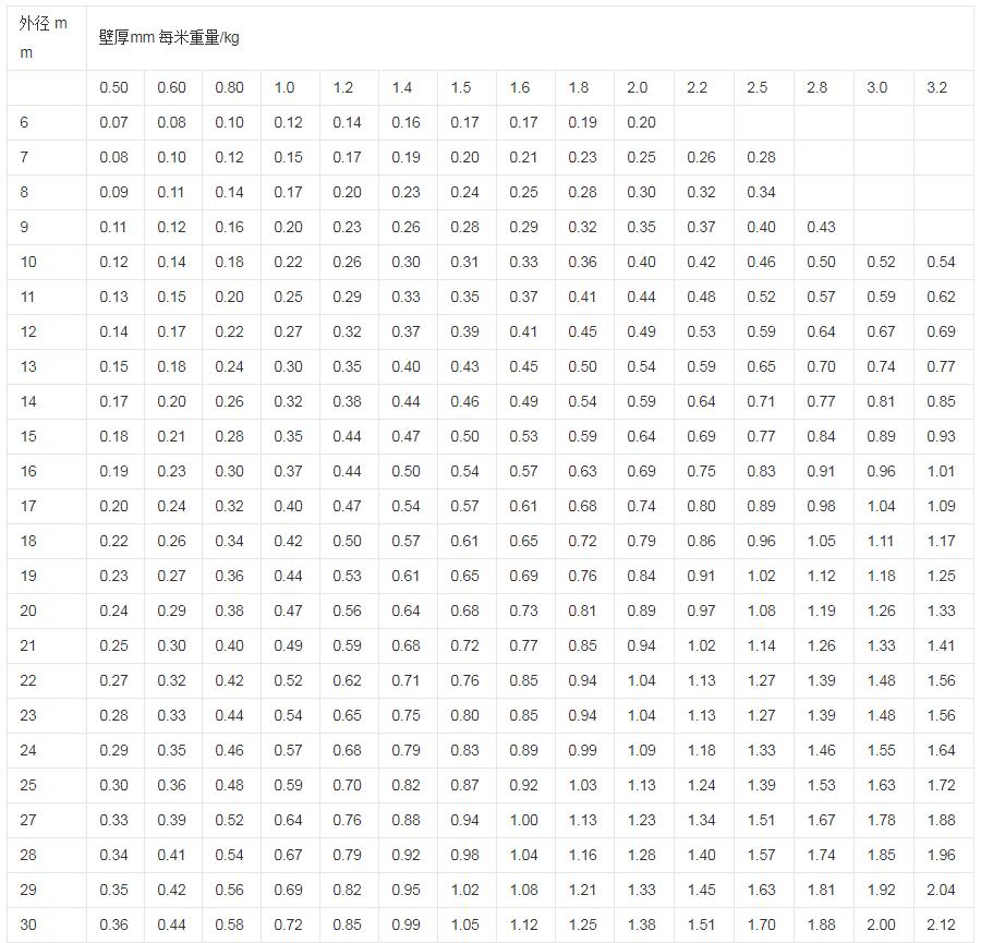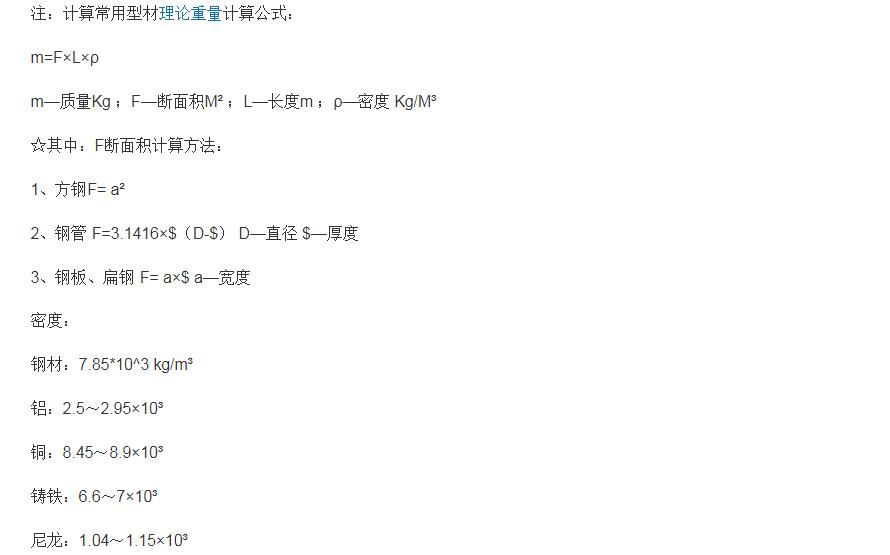 在這個重量表中,它是作為一個參數(shù)表存在的,方便我們進行實際質(zhì)量的計算,根據(jù)它的一些計算公式,然后采取表中的數(shù)值進行計算。具體公式為:m=F×L×ρ,m—質(zhì)量Kg ;F—斷面積M² ;L—長度m ;ρ—密度 Kg/M³