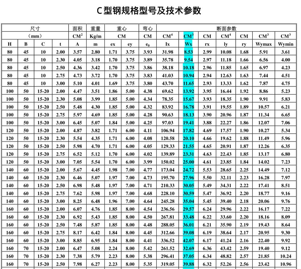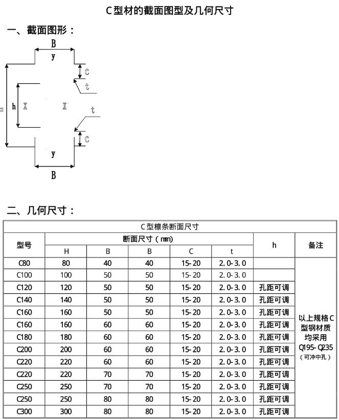 由于不同領(lǐng)域所使用到的C型鋼是不一樣的,所以大多數(shù)鋼材生產(chǎn)商或者銷售商都會把不同規(guī)格的C型匯總在一起,這也意味著從c型鋼規(guī)格表型號大全中是可以獲取每一種C型鋼的規(guī)格及其對應(yīng)的技術(shù)參數(shù),比如C80、C100、C120、C140、C160、C180、C200、C220、C250、C300等,每種規(guī)格對應(yīng)的重量、面積、重心、彎心、斷面參數(shù)都是不一樣的。