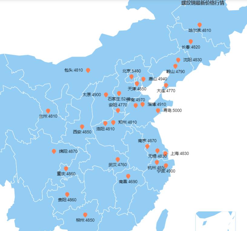 螺紋鋼最新全國價(jià)格在4800附近變動(dòng),螺紋鋼全國最低價(jià)格的城市是南昌,價(jià)格是4960元/噸。螺紋鋼全國最高價(jià)格的城市是北京,價(jià)格是5480元/噸。