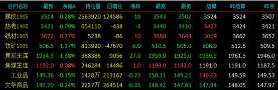 今日螺紋鋼期貨1905主力合約上下震蕩,盤尾收跌。全天最高3543,最低3502,收于3514,較上一日結(jié)算價(jià)格下跌10元,跌幅0.28%。