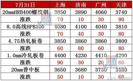 7月31日,全國(guó)鋼材市場(chǎng)價(jià)格大幅上漲。上海、濟(jì)南、廣州、天津、重慶等22個(gè)城市20mm螺紋鋼價(jià)格上漲10-90元/噸。4.75熱軋板卷市場(chǎng)價(jià)格大幅上漲。上海、杭州、濟(jì)南、京津冀、沈陽(yáng)、西安等21個(gè)市場(chǎng)價(jià)格上漲20—100元/噸。20mm中厚板市場(chǎng)價(jià)格小幅上漲。上海、杭州、廣州、京津冀、沈陽(yáng)、西安等21個(gè)市場(chǎng)價(jià)格上漲10—70元。