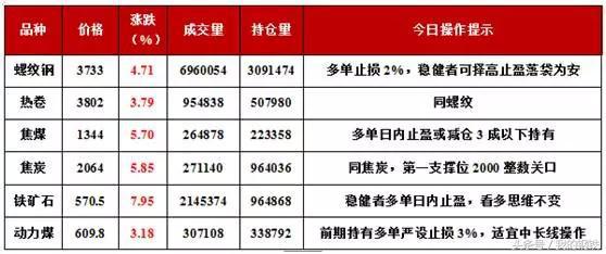 黑色系集體爆發(fā),截止收盤,鐵礦石封死漲停,焦炭、焦煤大漲逾5%,螺紋鋼大漲4.71%,熱卷大漲3.79%,動(dòng)力煤大漲3.18%。
