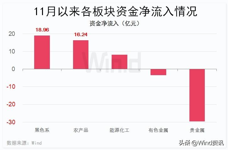 按板塊區(qū)分,11月以來(lái),黑色系板塊獲得資金凈流入規(guī)模最高,達(dá)18.96億元。
