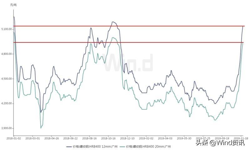 Wind數(shù)據(jù)統(tǒng)計(jì)顯示,廣州地區(qū)最新一期螺紋鋼HRB400 20mm和12mm的報(bào)價(jià)分別達(dá)4940元/噸、5140元/噸,均創(chuàng)逾1年新高,并接近上一輪高點(diǎn)。