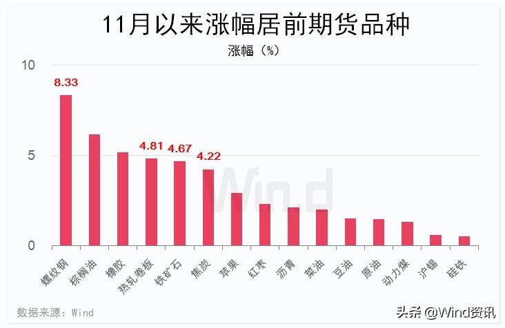 期貨方面,Wind統(tǒng)計(jì)顯示,11月以來(lái),黑色系多個(gè)品種攀升明顯,成材方面,螺紋鋼漲超8%,熱軋卷板漲近5%;原材方面,鐵礦石漲逾54.5%,焦炭漲超4%。黑色系板塊持續(xù)領(lǐng)漲商品期貨市場(chǎng)。