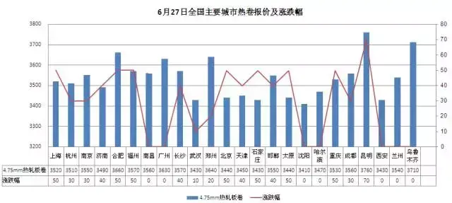 熱軋板卷方面:今日熱卷依舊小幅上漲,昆明、邯鄲漲幅較大,分別為70元和100元。全國24個主要市場4.75 熱軋板卷平均價格3523元/噸,較上個交易日上漲32元/噸。其中4.75mm熱軋板卷上海上調(diào)50元報3420元/噸,北京4.75mm熱軋板卷上調(diào)50元報3440元/噸;長沙上漲40元報3580元/噸;昆明市場上漲70元報3750元/噸。今日國內(nèi)熱卷市場普遍價格上調(diào),但市場出貨一般,對于后市大多商家表示跟著市場走,不敢輕易做出預(yù)期,目前由于鋼市進入淡季,下游需求減弱,貿(mào)易商哦著呢缸體表現(xiàn)謹慎,今日價格再次上漲,跟近期期貨震蕩上揚刺激現(xiàn)貨拉漲有關(guān)。所以短期價格或被動小幅趨強。