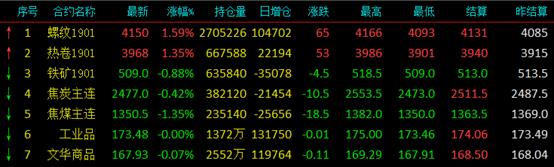 今日螺紋鋼期貨1901主力合約穩(wěn)打穩(wěn)扎,一路震蕩上漲。全天最高4166元,最低4093元,收于4150元,較上一日結(jié)算價格上漲65元,漲幅1.59%。