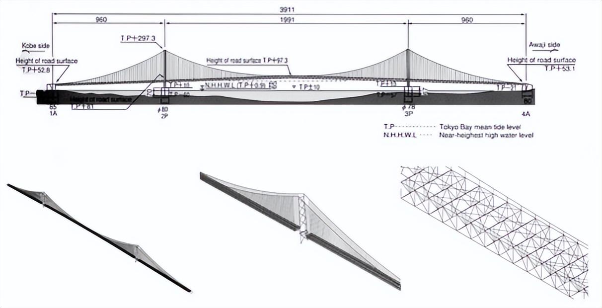 日本明石海峽大橋是世界上最大跨徑的懸索橋,主跨度1991m,風(fēng)致穩(wěn)定性分析非常重要,分析涉及高度非線(xiàn)性。Abaqus被用來(lái)進(jìn)行該橋的側(cè)向扭振屈曲分析。(該分析來(lái)源于SIMULIA全球年會(huì)論文,由橫濱國(guó)立大學(xué)Ishihara等人完成)