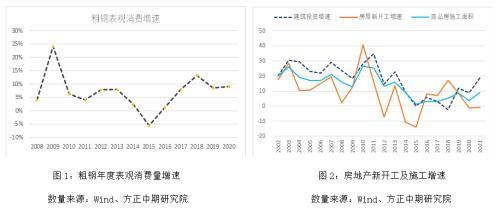 房地產(chǎn)和基建帶動(dòng)的建筑業(yè)用鋼對(duì)鋼材需求影響達(dá)到60%以上,房地產(chǎn)鏈條對(duì)鋼材需求的影響能達(dá)到40%。2008年以來(lái),從粗鋼表觀消費(fèi)和商品房新開(kāi)工面積來(lái)看,兩者同比增速整體走勢(shì)較為一致,而新開(kāi)工環(huán)節(jié)耗鋼量及增速較高。