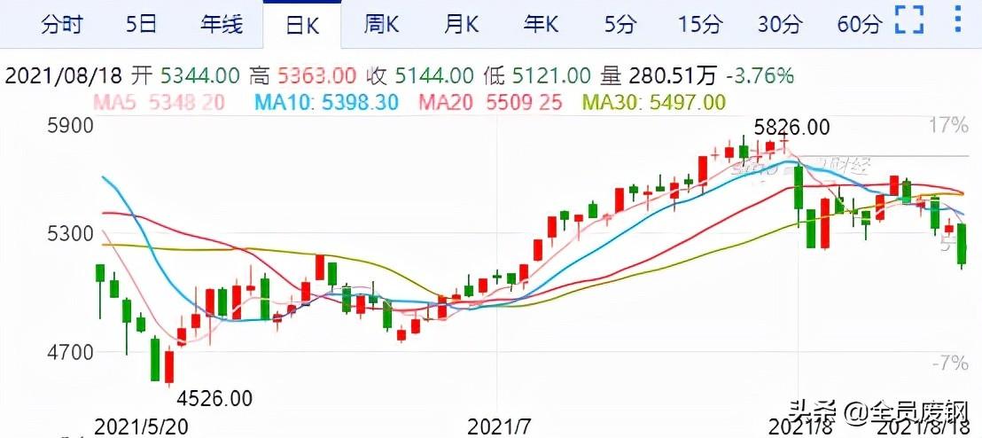 8月中旬以來(lái),期螺01合約從5600元跌到今天低點(diǎn)5125,累計(jì)下跌475元,鐵礦更是陰跌不斷。