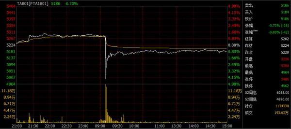 如PTA主力合約,在早盤驚現(xiàn)跳水暴跌,最大跌幅達到5%,伴隨著成交量的巨幅攀升,最后很快反彈,最終收盤時僅收跌0.73%。