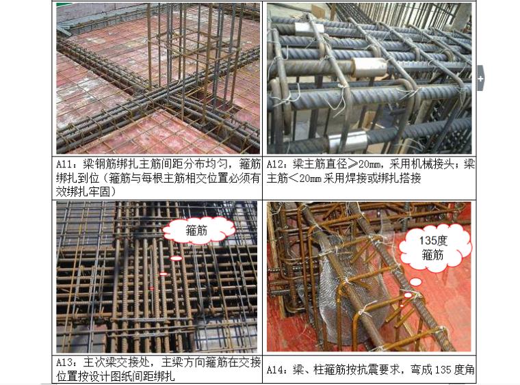 A11:梁鋼筋綁扎主筋間距分布均勻,箍筋綁扎到位(箍筋與每根主筋相交位置必須有效綁扎牢固)