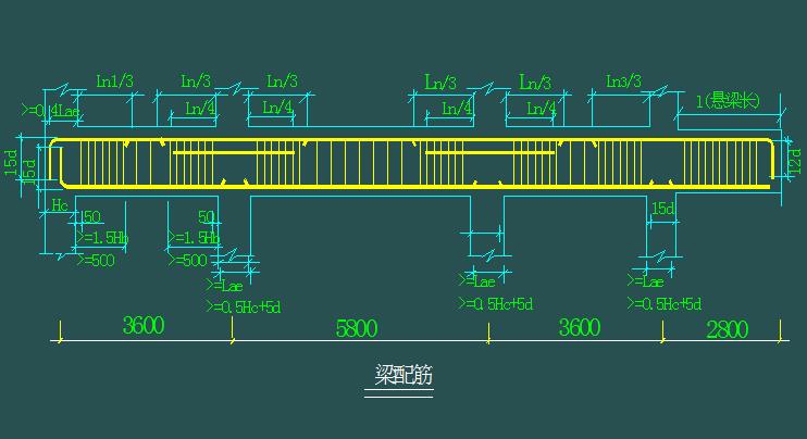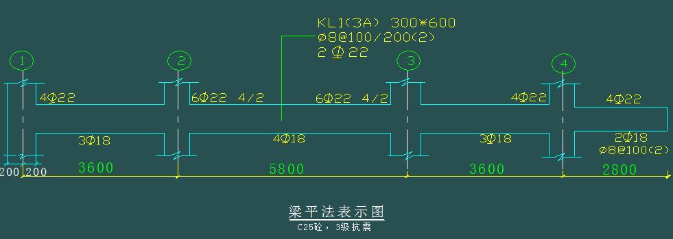 原位標(biāo)注表示:支座1上部縱筋為4根直徑22的二級(jí)鋼,支座2兩邊上部縱筋為6根直徑22的二級(jí)鋼分兩排,上一排為4根,下一排為2根;第一跨跨距3600,下部縱筋為3根直徑18的二級(jí)鋼,全部伸入支座,;第二跨跨距5800,下部縱筋為4根直徑18的二級(jí)鋼,全部伸入支座;以后類推。