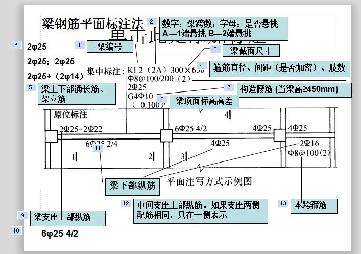 看了梁的各種構(gòu)造后可以看看最關(guān)鍵的兩種標(biāo)注方式:梁的原位標(biāo)注的內(nèi)容包括梁支座上部縱筋、梁下部鋼筋、附加箍筋或吊筋以及當(dāng)梁上集中標(biāo)注不適用于某跨或某懸挑部分時(shí),施工時(shí)按原位標(biāo)注數(shù)值取用。(1) 梁支座上部縱筋