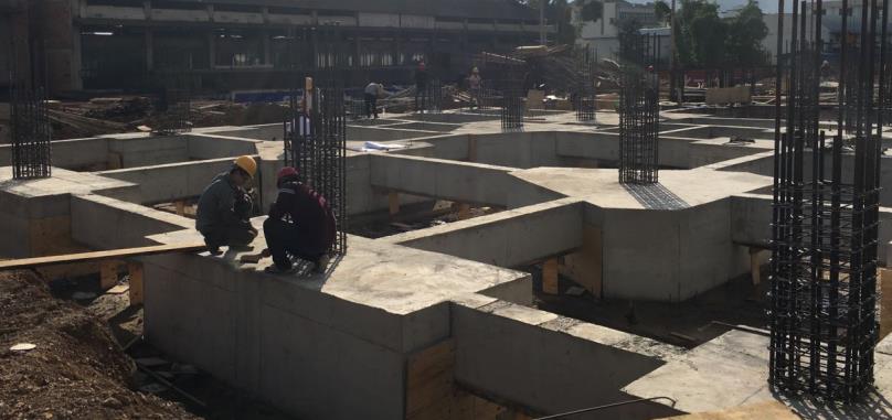 ④地梁鋼筋依據(jù)彈出的定位線,支設(shè)底模后安放墊塊,綁扎鋼筋。