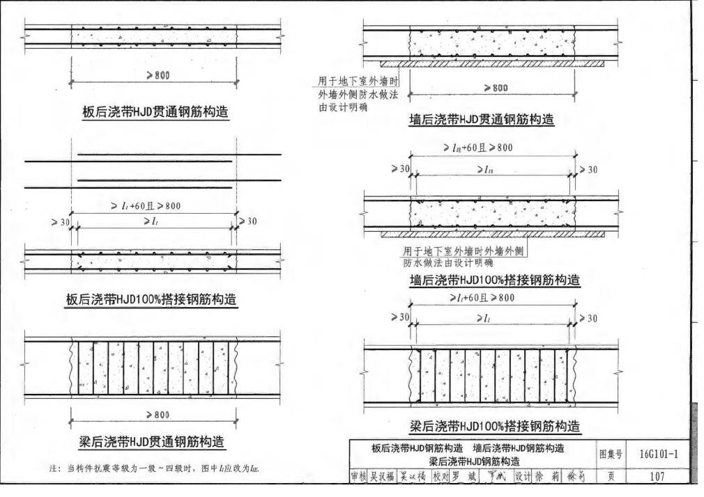 后澆帶預(yù)留鋼筋為L(zhǎng)l+30,搭接僅需滿足Ll,但在實(shí)際施工過(guò)程中容易理解成預(yù)留長(zhǎng)度≥Ll+60且≥800,這個(gè)是后澆帶的寬度要求而不是鋼筋要求。