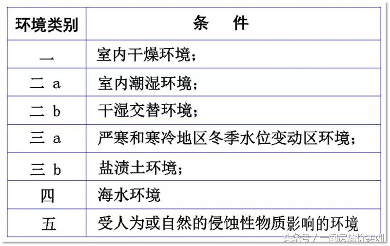 規(guī)范中給出了環(huán)境類別的具體條件,不過,這是給設計人員考慮的,我們預算員只了解就可以了,下面我把環(huán)境類型簡化了一下,見表1。
