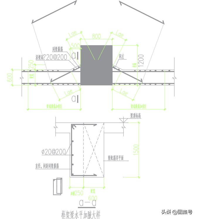 第一點(diǎn),其水平加腋箍筋的是環(huán)形,但是你們發(fā)現(xiàn)沒?我給的圖紙的水平加腋箍筋不是環(huán)形的,但是而是錨固進(jìn)去的,具體查看圖加腋施工圖紙2,我們發(fā)現(xiàn)這里有個(gè)問題就是圖紙給的加密箍筋和小的箍筋樣子兩個(gè)都對(duì)不上,我們?cè)趨⒖紙D紙,正確的都應(yīng)該是環(huán)形布置,所以我們這里暫按環(huán)形布置計(jì)算(注:這里出現(xiàn)問題一般和設(shè)計(jì)溝通下,確保是否設(shè)計(jì)錯(cuò)誤,這樣較為妥當(dāng))。