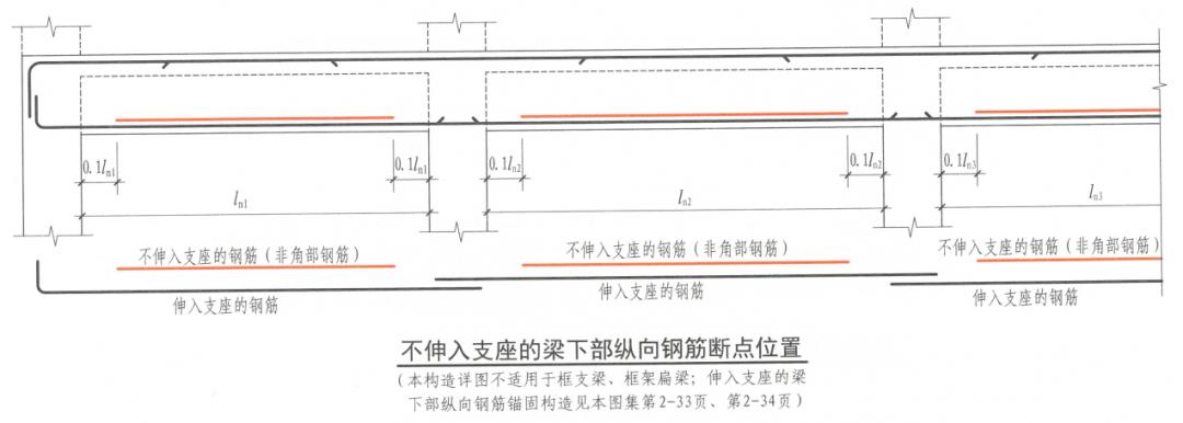 梁支座位置的底筋結(jié)果主要用于判斷底筋截斷的數(shù)量。按照22G101圖集的相關(guān)要求,如下圖所示,不伸入支座的梁下部縱向鋼筋斷點位置取0.1倍梁凈跨位置,并非在端節(jié)點位置。所以直接采用計算結(jié)果中圖面輸出的數(shù)據(jù)來判斷梁底筋可以截斷的鋼筋數(shù)量是欠妥的。