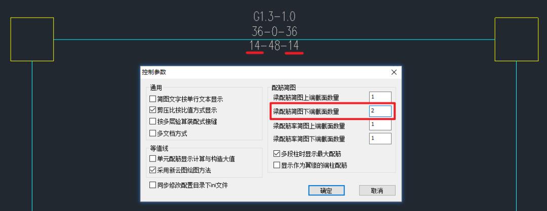 在YJK中,“梁配筋簡圖下端截面數(shù)量”的參數(shù)默認(rèn)設(shè)置為1,故圖面輸出的梁支座位置底筋數(shù)據(jù)僅考慮左右兩個端部節(jié)點位置截面。如果將參數(shù)值設(shè)置為2,則YJK中圖面輸出的數(shù)據(jù)和PKPM一致。