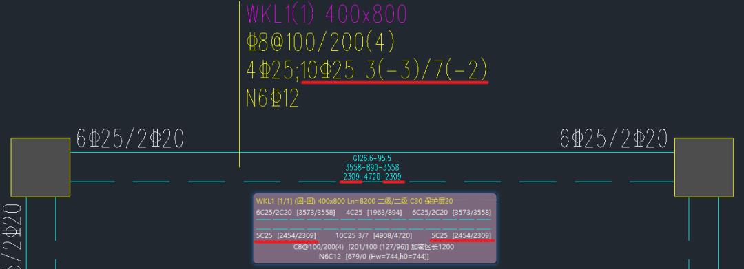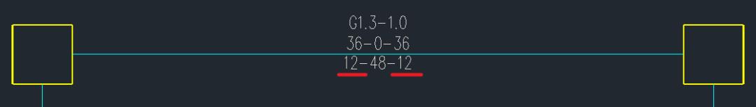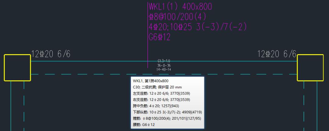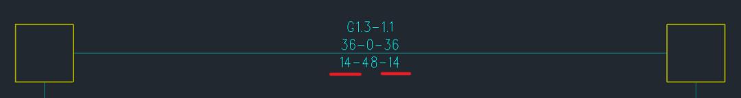 對比兩個軟件在施工圖中自動生成的實配鋼筋,如下圖所示,梁底實配鋼筋和鋼筋截斷的處理是一致的。YJK在施工圖的配筋簡圖中可以看到梁支座底筋的計算結(jié)果為14cm2,和PKPM在計算結(jié)果中輸出的一致。但從底筋實配鋼筋截斷數(shù)量判斷,應(yīng)該不是按14cm2來確定的。由于在構(gòu)件TIP提示中并未輸出梁支座底筋的計算結(jié)果,故無法判斷YJK的具體處理規(guī)則。