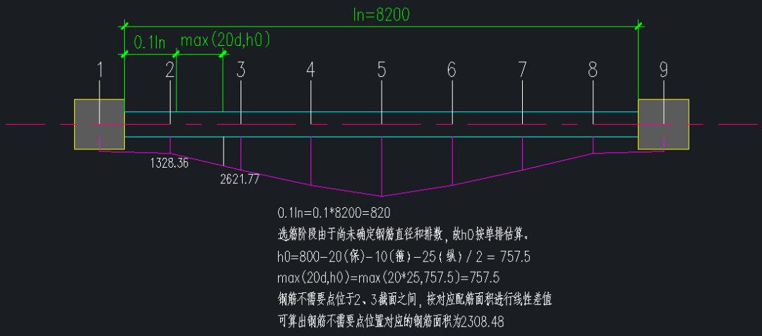 在PKPM梁施工圖中,構(gòu)件TIP提示明確輸出了各個位置的計算和是實配鋼筋面積,由上圖可見,梁端支座底筋的選筋面積為2309mm2。在PKPM梁施工圖中,程序除可以考慮圖集上對于鋼筋斷點的位置要求外,還參照混凝土規(guī)范9.2.3條要求確定梁底縱向鋼筋的不需要點。并以縱筋不需要點位置對應(yīng)的鋼筋面積作為依據(jù)進(jìn)行梁底實配鋼筋的截斷。具體計算確定方法如下圖所示。