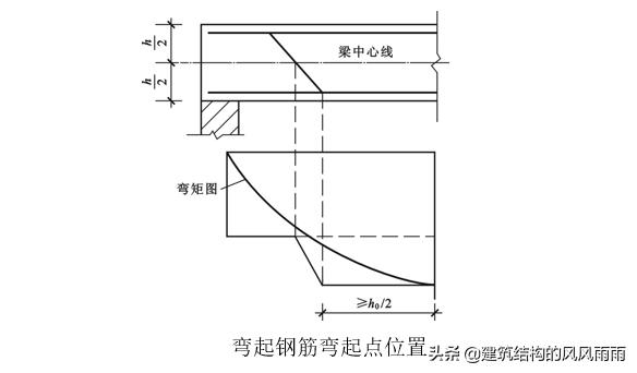 在梁的受拉區(qū)中,彎起鋼筋的彎起點,可在按正截面受彎承載力計算不需要該鋼筋截面面積之前彎起;但彎起鋼筋與梁中心線的交點,應在不需要該鋼筋的截面之外;同時,彎起點與按計算充分利用該鋼筋的截面之間的距離,不應小于h0/2。