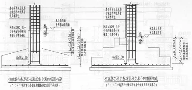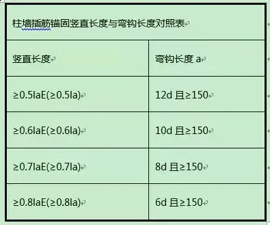 當(dāng)基礎(chǔ)為獨(dú)基條基樁基高度>= Lae時(shí),柱中部插筋直錨Lae且>=35d.柱角插筋彎折長度=MAX(35D-直錨長度,6D,150)