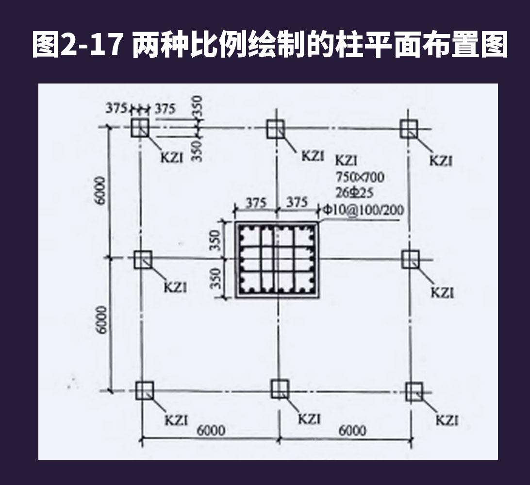 柱平面布置圖的主要功能是表達豎向構(gòu)件(柱或剪力墻)。當(dāng)主體結(jié)構(gòu)為框架-剪力 墻結(jié)構(gòu)時,柱平面布置圖通常與剪力墻平面布置圖合并繪制。柱平面布置圖可采用一種 或兩種比例繪制。兩種比例是指柱軸網(wǎng)布置采用一種比例,柱截面輪廓在原位采用另一 種比例適當(dāng)放大繪制的方法,如圖2-17所示。在用一種或兩種比例繪制的柱平面布置圖 上,釆用截面注寫方式或列表注寫方式,并且加注相關(guān)設(shè)計內(nèi)容后,便構(gòu)成了柱平面布置圖。