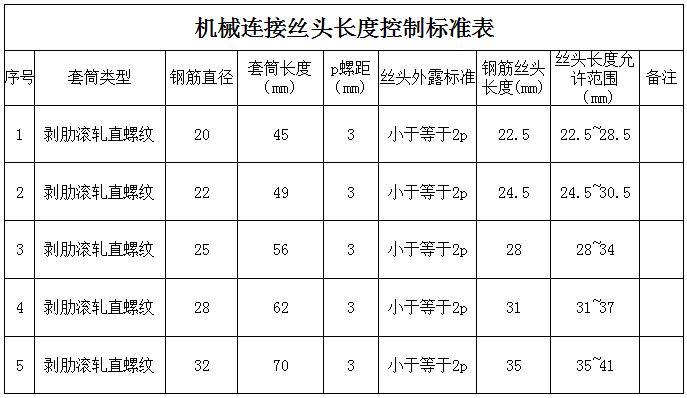 2)直螺紋接頭的現(xiàn)場加工應符合下列規(guī)定:a.鋼筋端部應用砂輪切割機切平1~2cm后加工螺紋; b.鋼筋絲頭長度應滿足規(guī)范要求,公差應為0~2.0p(p為螺距),絲頭長度控制范圍如下表所示;