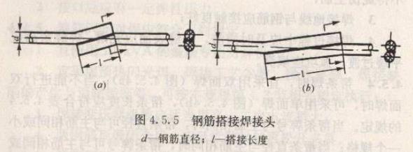 4)鋼筋接頭采用搭接或幫條電弧焊時,宜采用雙面焊縫,雙面焊縫困難時,可采用單面焊縫,采用雙面焊時焊縫長度L=5d+1cm+1cm,采用雙面焊時焊縫長度L=10d+1m+1m,搭接接頭鋼筋的端部應預彎,使搭接鋼筋的軸線位于同一直線上。(d為鋼筋直徑)