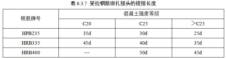 4)受拉鋼筋綁扎接頭的搭接長度,應符合表6.3.7的規(guī)定;受壓鋼筋綁扎接頭的搭摟長度,應取受拉鋼筋綁扎接頭長度的0.7倍。