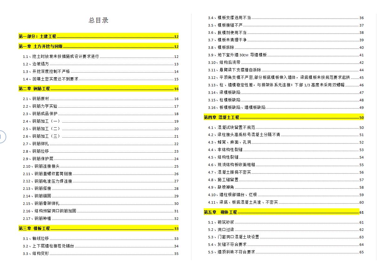 239頁建筑工程質(zhì)量管理圖集,根據(jù)分項(xiàng)施工細(xì)節(jié)進(jìn)行劃分,從地基開挖、鋼筋混凝土配比、墻體構(gòu)造、裝修裝飾等數(shù)十項(xiàng),用強(qiáng)有力的依據(jù)去挑刺,領(lǐng)導(dǎo)看了夸你有能耐,施工員也不得不服。