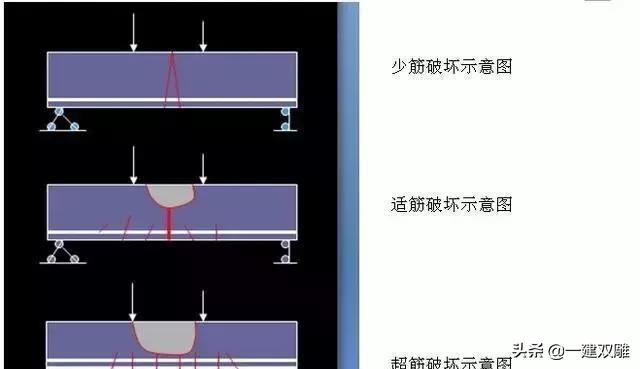 (2)超筋破壞(就是普遍認(rèn)為的鋼筋越粗越好):當(dāng)構(gòu)件受拉區(qū)配筋量很高時(shí),則破壞時(shí)受拉鋼筋不會(huì)屈服,破壞是因混凝土受壓邊緣達(dá)到極限壓應(yīng)變、混凝土被壓碎而引起的。發(fā)生這種破壞時(shí),受拉區(qū)混凝土裂縫不明顯,破壞前無(wú)明顯預(yù)兆,并且受拉鋼筋的強(qiáng)度未被充分利用而不經(jīng)濟(jì)。這種梁在沒(méi)有明顯預(yù)兆的情況下由于受壓區(qū)混凝土突然壓碎而破壞,**慣上常稱(chēng)之為“脆性破壞”。