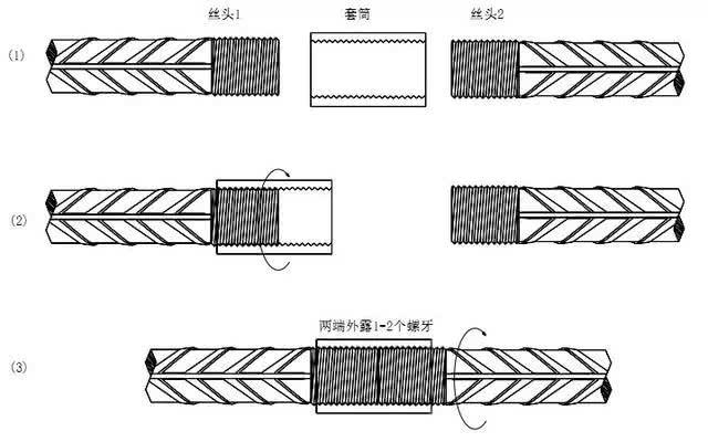 絲頭加工完成,經(jīng)外觀檢驗合格,即可進(jìn)行連接。連接方法:將套筒旋入其中一根鋼筋絲頭,直到端頭外露1-2個螺紋,此時鋼筋端頭應(yīng)位于套筒中間位置,然后將另一根待連接的鋼筋絲頭從另一端旋入套筒,直到端頭對頂,用扳鉗擰緊,完成連接。