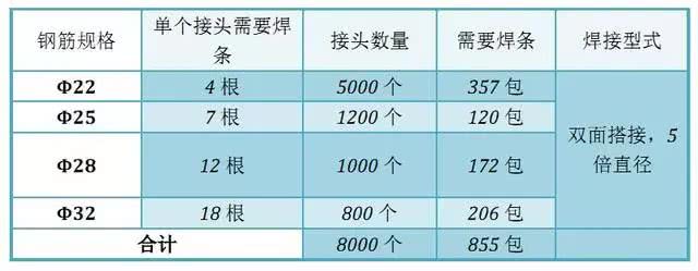 以某工程為例,本工程主筋規(guī)格為Φ22mm-Φ32mm螺紋鋼,鋼筋接頭共計8000個,采用機械連接,投入一臺設(shè)備3名操作人員(1名機械操作手和兩名力工),每天可完成接頭300個,27天可完成加工。如采用雙面搭接電弧焊,同樣加工時間情況下,則需要投入三臺焊機9名操作人員(3名焊工和6名力工)。