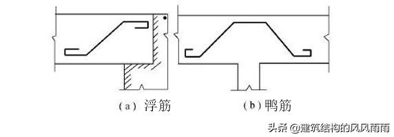 3、 當(dāng)不能將縱筋彎起而需單獨(dú)為抗剪要求設(shè)置彎筋時,應(yīng)將彎筋兩端錨固在受壓區(qū)內(nèi)(俗稱鴨筋)。彎起鋼筋不得采用浮筋。
