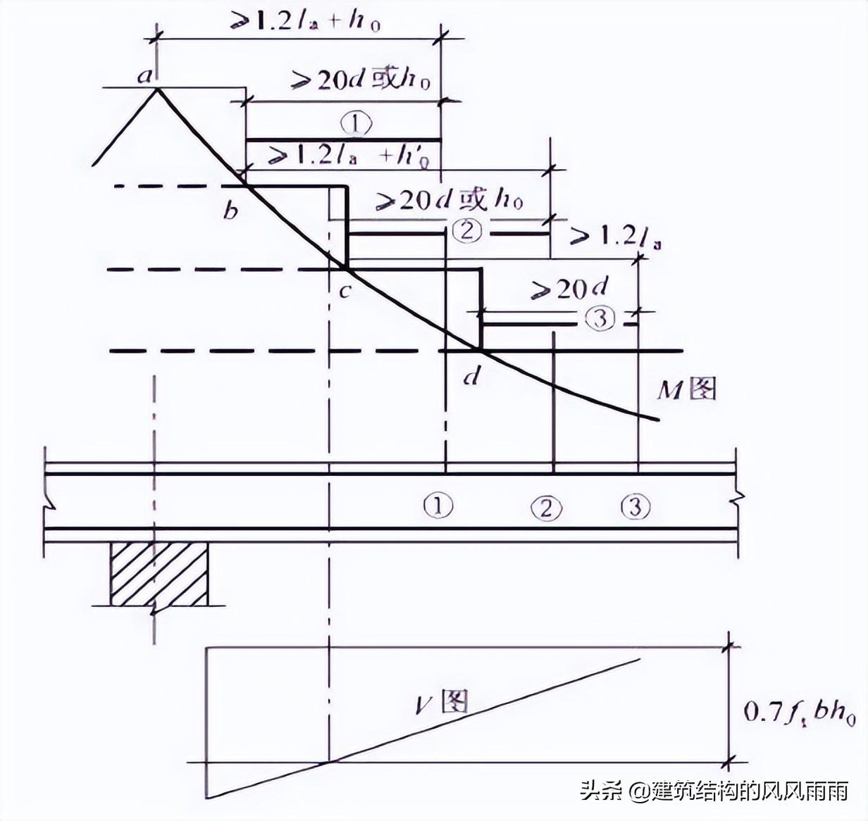 承受跨中正彎矩的縱向受力鋼筋一般不在跨內(nèi)截斷,而是一部分(或全部)伸入支座,一部分彎起;而連續(xù)支座或節(jié)點(diǎn)附近的負(fù)彎矩區(qū)段內(nèi)的縱向受拉鋼筋,則常在貫穿支座后的一定位置截斷,以節(jié)省鋼筋。