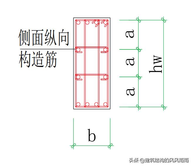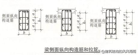 當(dāng)梁的腹板高度hw≥450mm時,在梁的兩側(cè)面沿高度配置縱向構(gòu)造鋼筋(腰筋),每側(cè)縱向構(gòu)造鋼筋(不包括梁上、下受力鋼筋及架立鋼筋)截面面積不小于腹板截面面積bhw的0.1%,間距不宜大于200mm,直徑為8~14mm,并用拉結(jié)鋼筋連接;拉結(jié)鋼筋直徑與箍筋相同,間距為箍筋間距的兩倍。薄腹梁在下部再加密一倍。