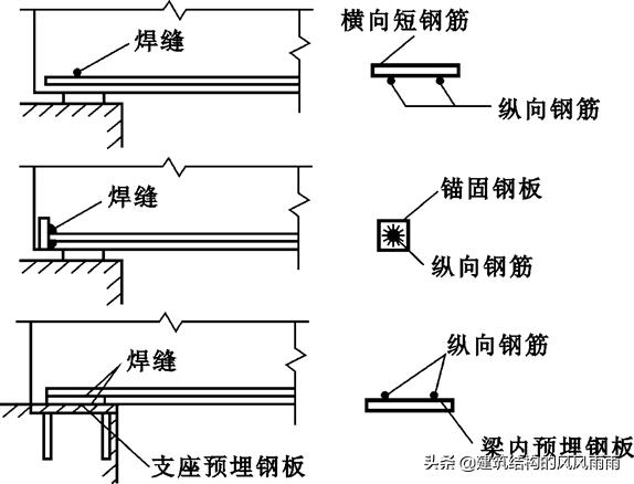 如縱向受力鋼筋伸入梁支座范圍內(nèi)的錨固長度不符合上述要求時,應(yīng)采取在鋼筋上加焊錨固鋼板或?qū)摻疃瞬亢附釉诹憾祟A(yù)埋件上等有效錨固措施,見下圖: