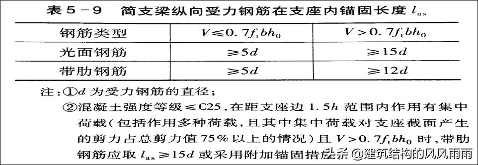 ③ 當(dāng)計算中充分利用鋼筋的抗壓強(qiáng)度時(此時支座受負(fù)彎矩作用,支座截面按雙筋梁計算),鋼筋伸入支座的錨固長度不應(yīng)小于0.7la。