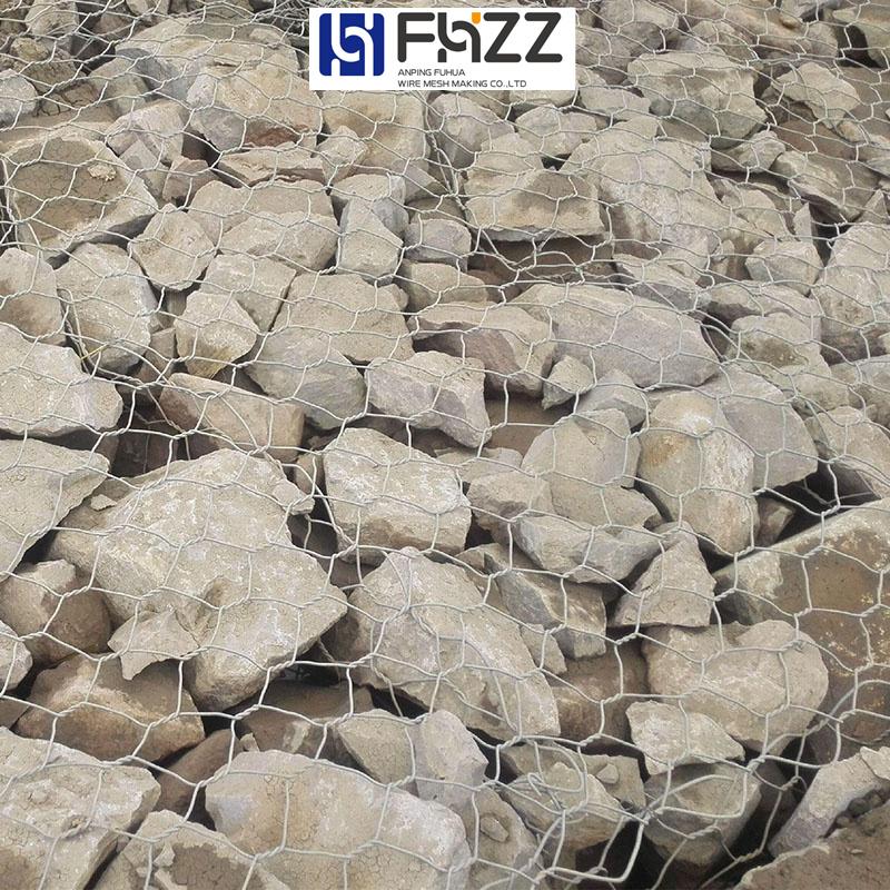 六角形鍍鋅鐵絲石籠網(wǎng)片采用特殊工藝?yán)p繞在鋼筋骨架上,組裝成六面體石籠網(wǎng)箱,網(wǎng)箱長寬高尺寸根據(jù)工程設(shè)計需要確定,如3×1.5×0.5m、2×1.5×0.5m、1×1.5×0.5m,不同尺寸的鉛絲籠相互搭配,以適應(yīng)復(fù)雜變化的地形環(huán)境。鉛絲石籠中盛裝卵石,裝填滿后將卵石鋪散平整并蓋好頂蓋,用4mm鍍鋅綁絲密集纏繞扎牢固。分層的鐵絲石籠應(yīng)錯縫拼接,起到相互加強(qiáng)的作用,以避免薄弱部位集中在一處,相鄰鐵絲石籠用4mm鍍鋅鐵絲扎牢,每50cm捆扎一次,以連接成一個整體