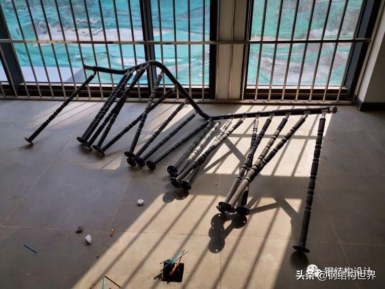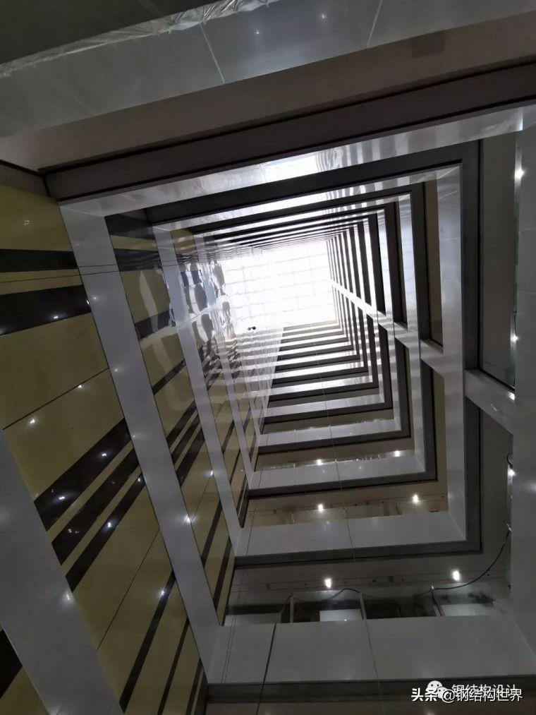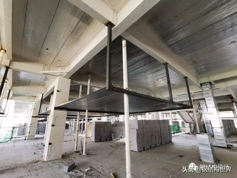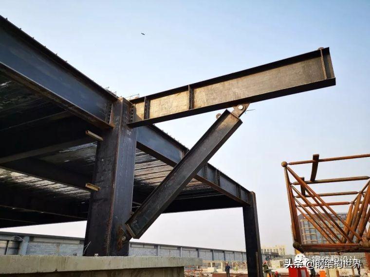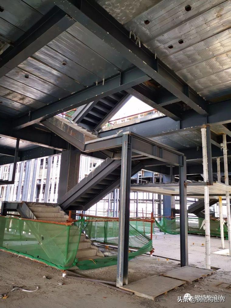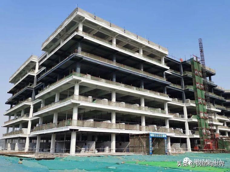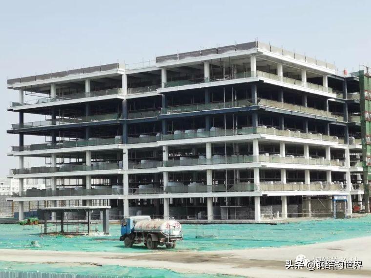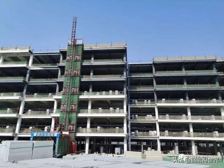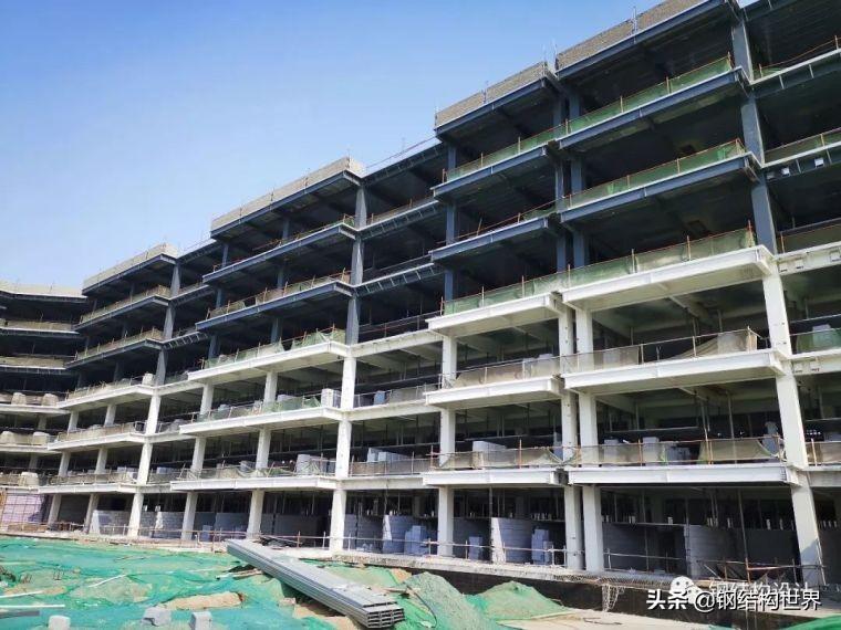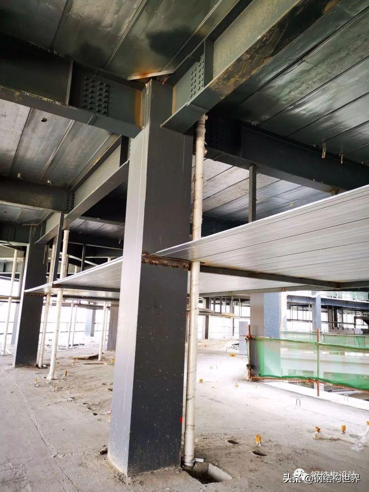 ▲整體施工照片,鋼結(jié)構(gòu)不同于混凝土結(jié)構(gòu),一般采用組合樓板,不用內(nèi)腳手架,施工速度較快。