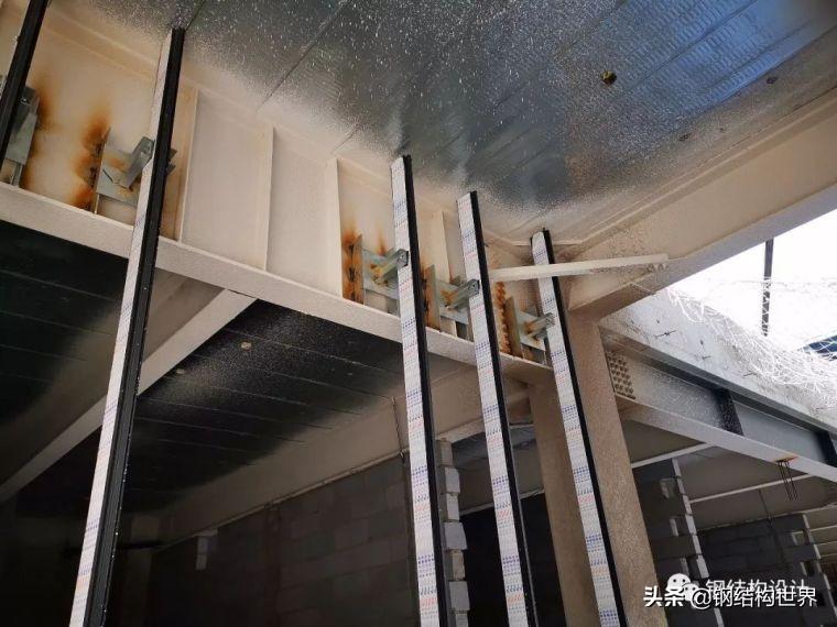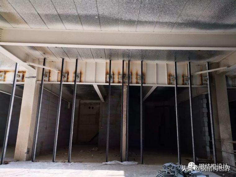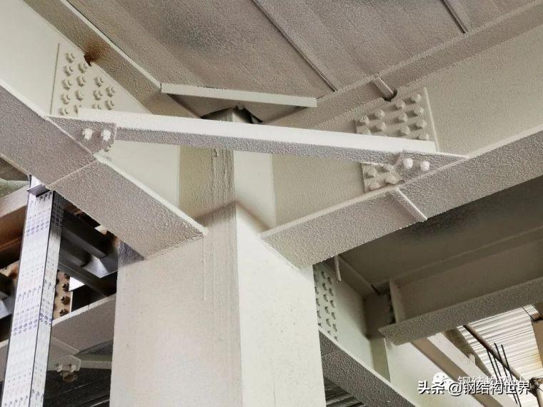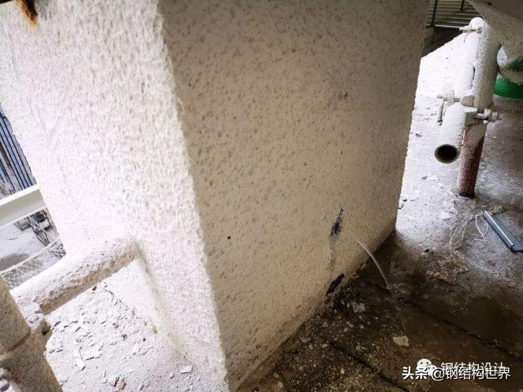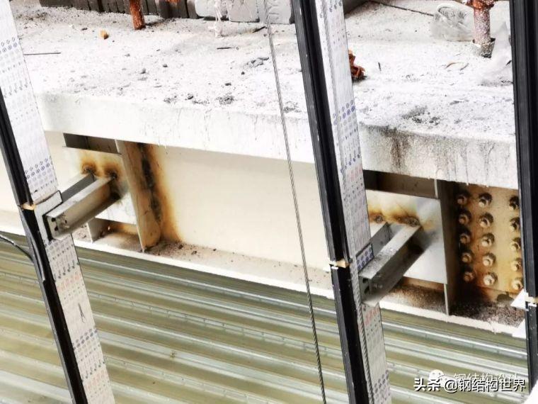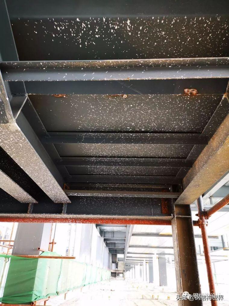 ▲鋼柱上的拉結(jié)鋼筋,鋼柱采用噴涂的厚型防火涂料。