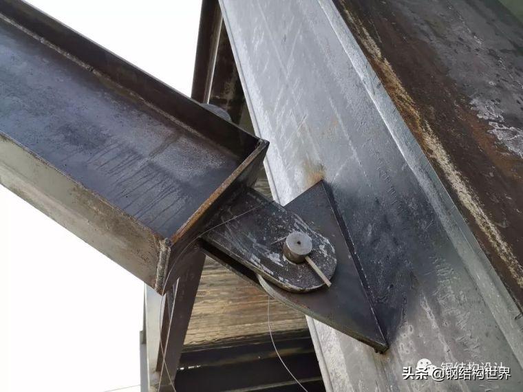 ▲斜撐與鋼柱的銷(xiāo)釘節(jié)點(diǎn),連接板太薄了,設(shè)置加勁肋更合理。