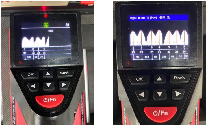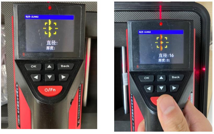 向同一個方向移動小車,但小車靠近鋼筋時出現(xiàn)黃色瞄準框,此時需要緩慢移動小車,瞄準框和中心線重合,中心線會變成紅色,紅色指示燈變亮,并發(fā)出滴滴聲,表示檢測到鋼筋;此時停止小車移動,讓小車停在鋼筋上方,按Fn健開始計算鋼筋直徑。