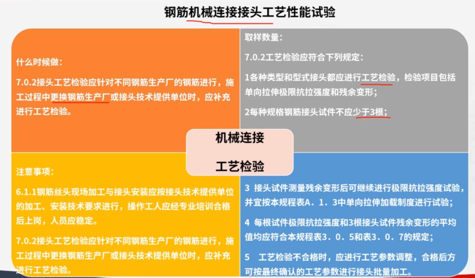 工藝檢驗:接頭工藝檢驗應(yīng)針對不同鋼筋生產(chǎn)廠的鋼筋進行,施工過程中更換鋼筋生產(chǎn)廠或接頭技術(shù)提供單位時,應(yīng)補充進行工藝檢驗。