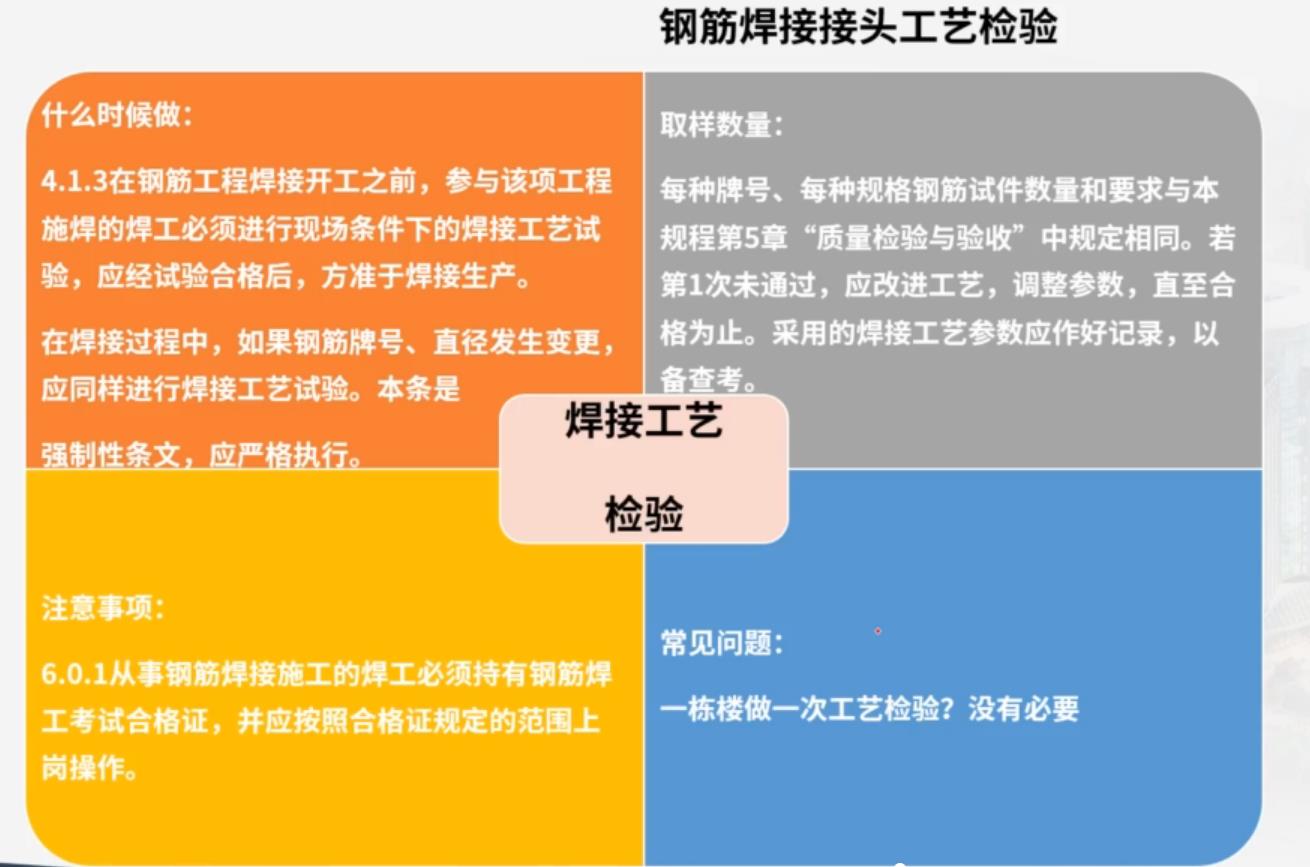 工藝檢驗:在鋼筋工程焊接開工之前,參與該工程施焊的焊工必須進行現(xiàn)場條件下的焊接工藝試驗,應(yīng)試驗合格后,方準予焊接生產(chǎn)。