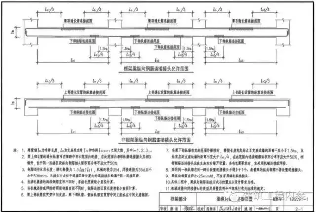 規(guī)范【11G101-1圖集(55頁)】規(guī)定:縱向受力鋼筋連接位置宜避開梁端、柱端、箍筋加密區(qū),如必須在此連接時,應(yīng)采用機械連接或焊接,接頭位置應(yīng)符合鋼筋混凝土施工規(guī)范規(guī)定。接頭位置詳見下圖【12G901-1圖集(2-1頁)】 。
