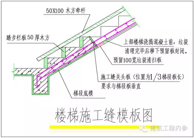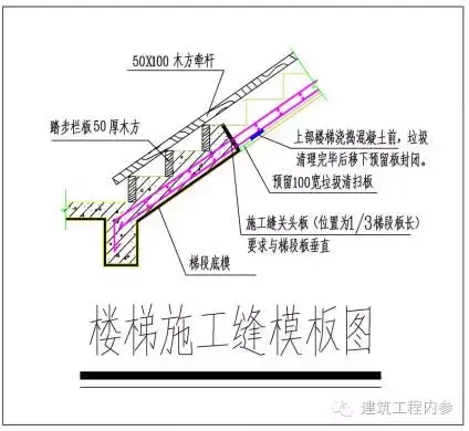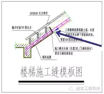 規(guī)范【GB50204-2002第7.4.5條 】規(guī)定 :確定施工縫位置的原則為:盡可能留置在受剪力較小的部位。樓梯施工縫一般留置在Ln/3(Ln梯段凈跨)處,即約第三個踏步處。